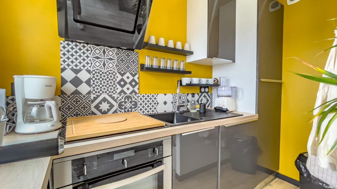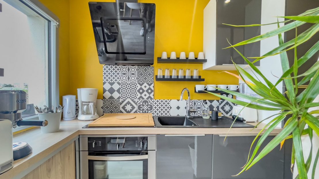 L’entrée s’ouvre sur un salon accueillant. La cuisine, entièrement équipée, est très pratique pour concocter de délicieux repas. Juxtaposée à la pièce de vie, elle facilite la convivialité et les échanges.