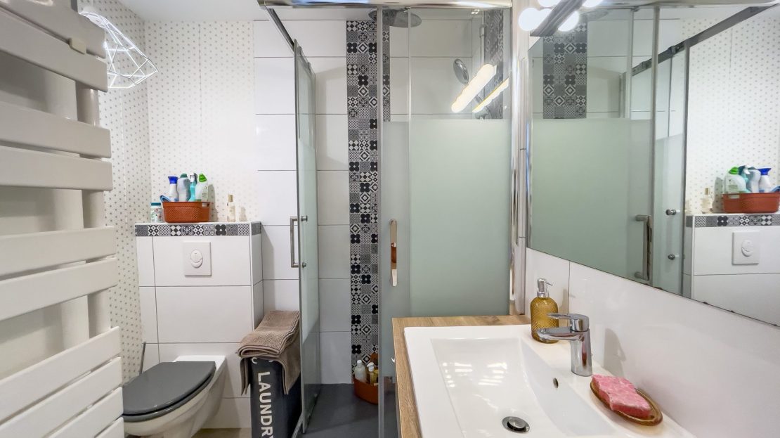 La salle d’eau se compose d’une douche, un lavabo, des WC suspendus ainsi qu’une machine à laver.