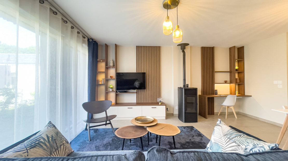 L’entrée vous emmène vers un espace de vie cosy soigneusement organisé. La cuisine, entièrement aménagée et équipée, est ouverte sur le salon. La décoration épurée met l’accent sur la finesse des matériaux utilisés. La couleur beige prône la simplicité tandis que le bois sublime l’espace et apporte une note chaleureuse. Le canapé moelleux invite à s’y plonger. Un coin bureau se niche en toute discrétion dans le prolongement du salon.