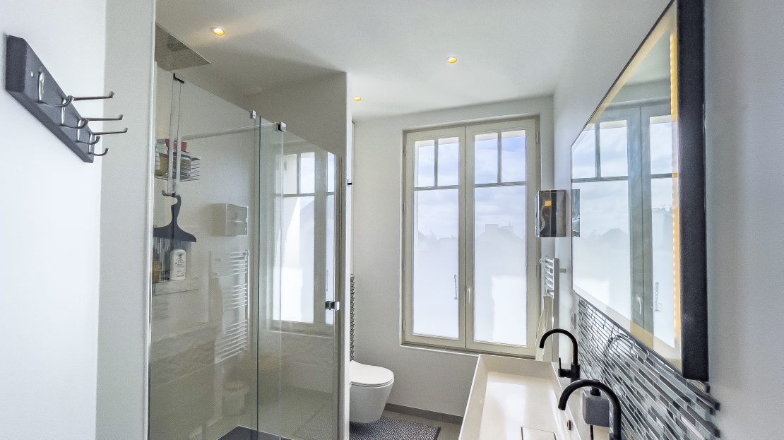 Moderne et fonctionnelle, la salle d’eau complète les prestations haut de gamme de cet appartement. Elle comprend une double vasque élégante, une grande douche et des WC suspendus. Une fenêtre apporte une lumière naturelle particulièrement appréciable, rendant l’espace encore plus agréable.