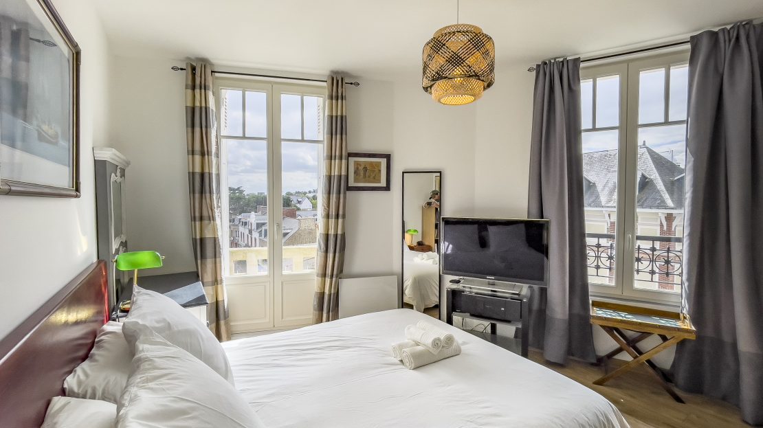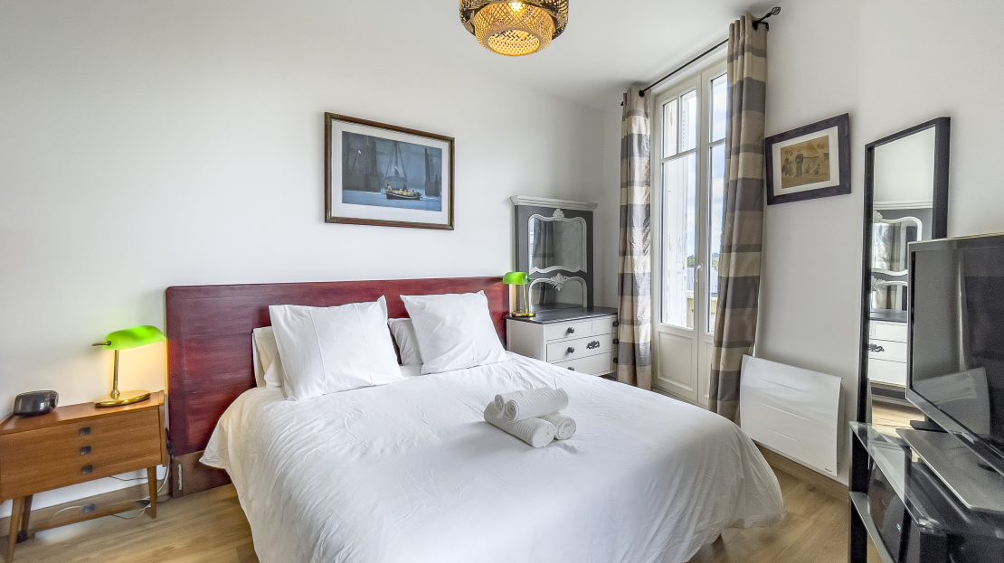 • La chambre parentale : très spacieuse, elle s’impose comme un véritable cocon de confort. Dotée d’un lit Queen Size (160×200), elle offre également un accès direct à un balcon privatif exposé plein sud. Avec sa vue charmante sur les toits de la ville, il sera un espace paisible pour débuter ou conclure vos journées.