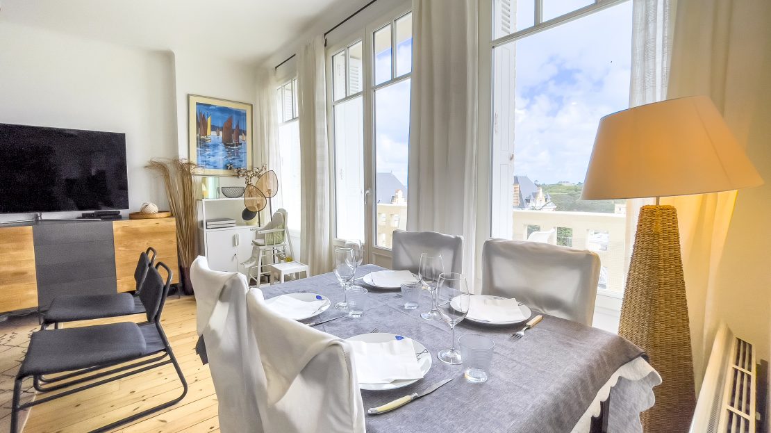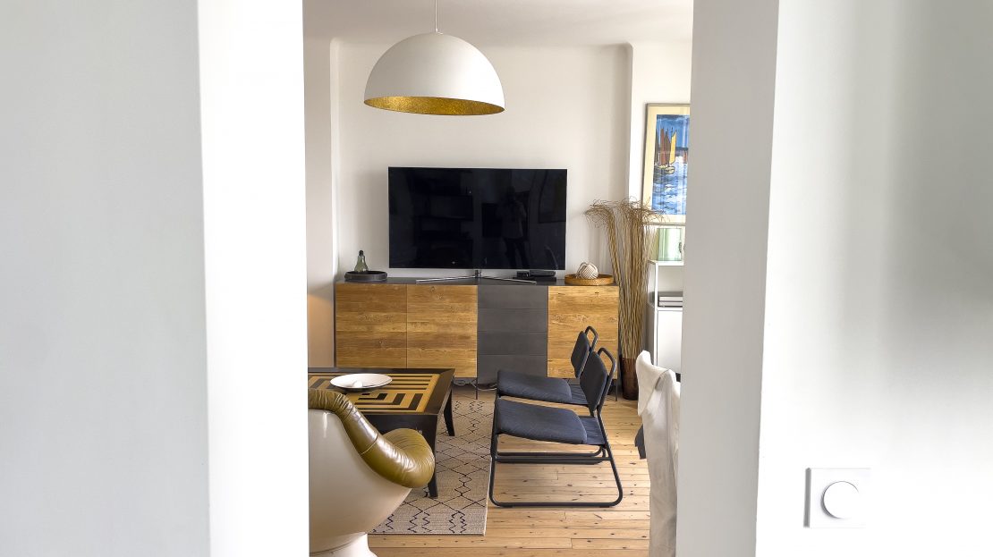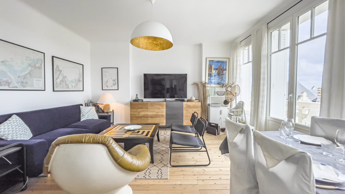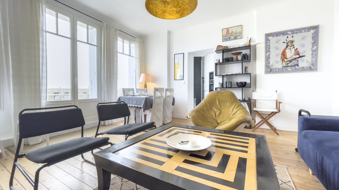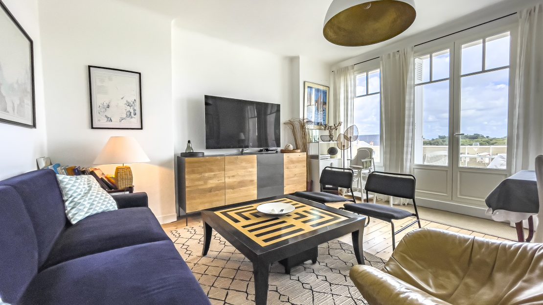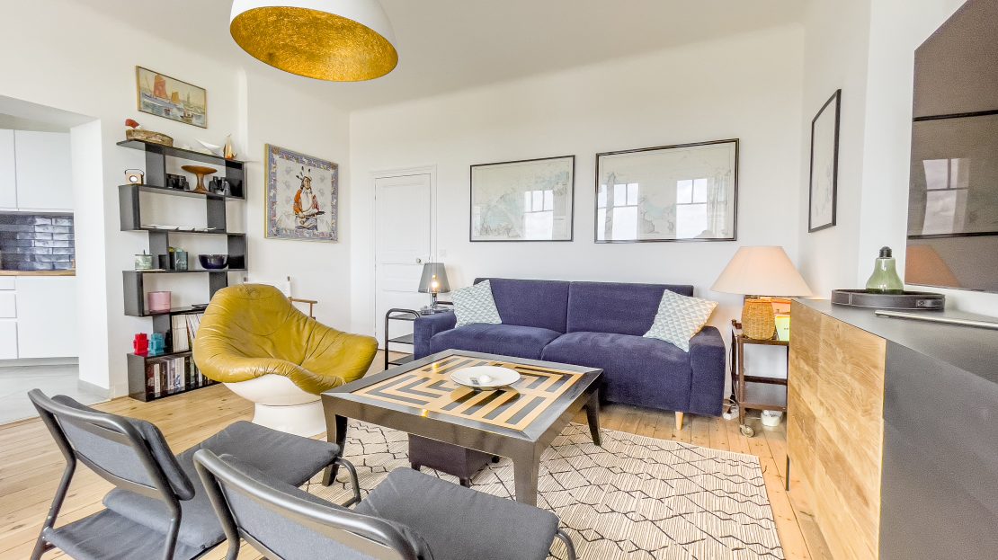 • Le salon : décoré dans un style rétro inspiré des années 70-80, il est à la fois chaleureux et accueillant. Vous y trouverez des fauteuils confortables, une jolie table basse, et au mur des cartes marines donnent à cet espace une touche originale. Une porte-fenêtre donne directement accès au balcon. Grâce à son exposition Est, idéale pour y déguster une boisson chaude le matin en admirant la mer ou encore vous y reposer avec un bon livre dans l’après-midi.