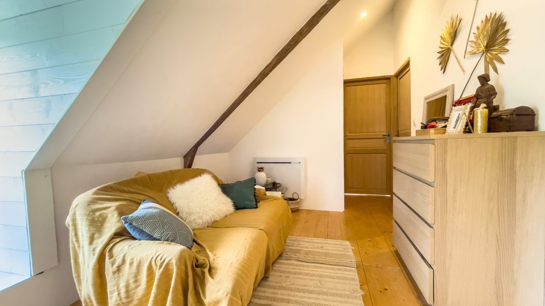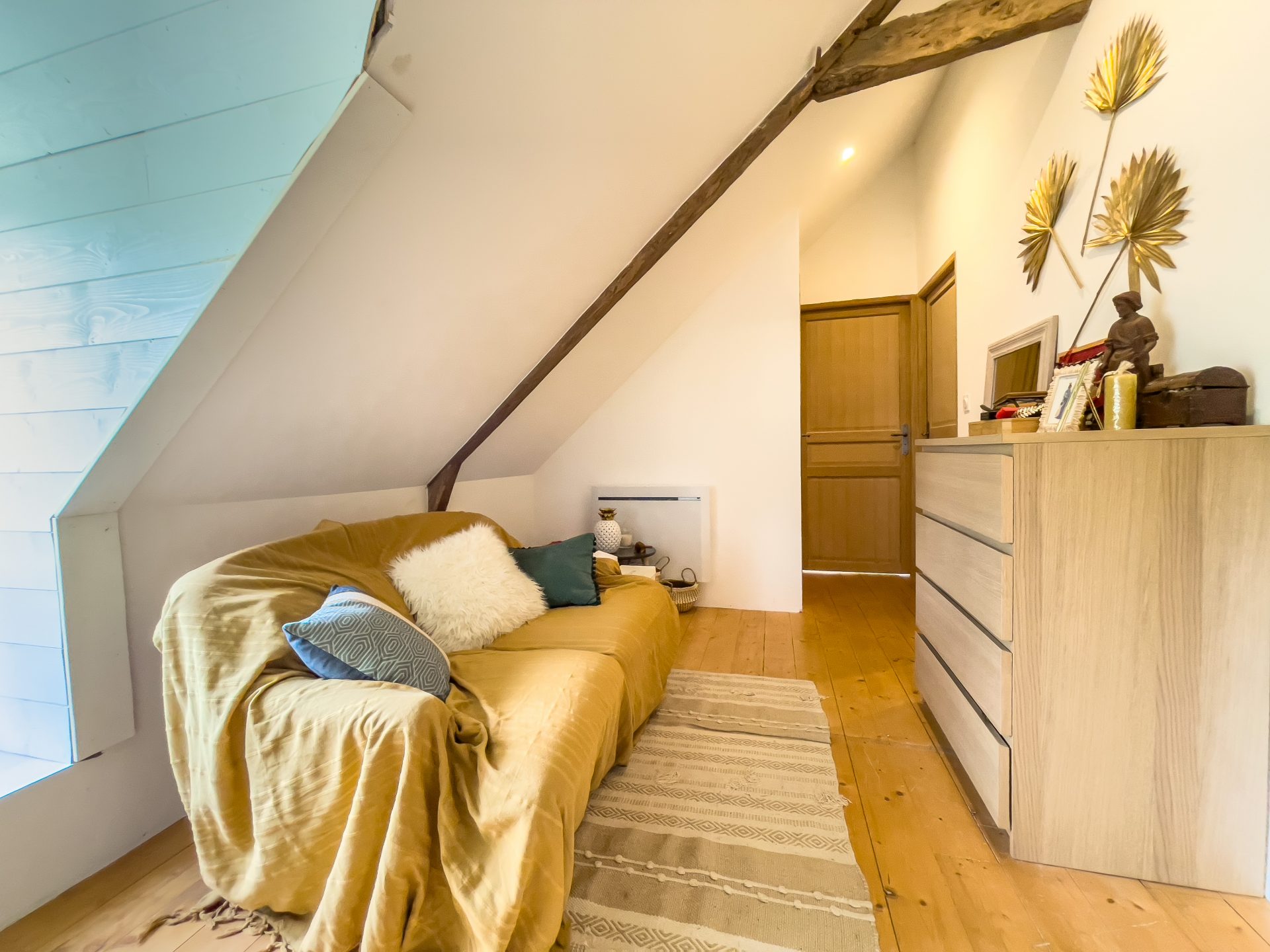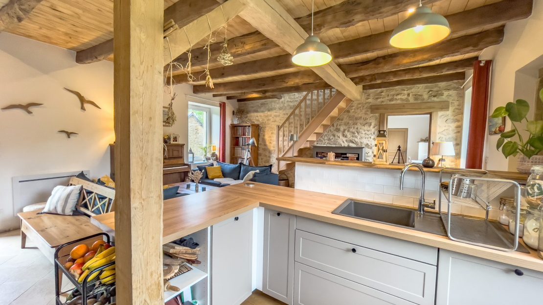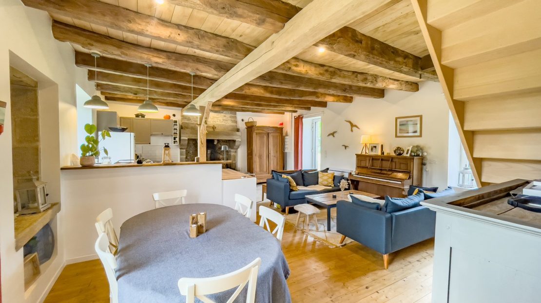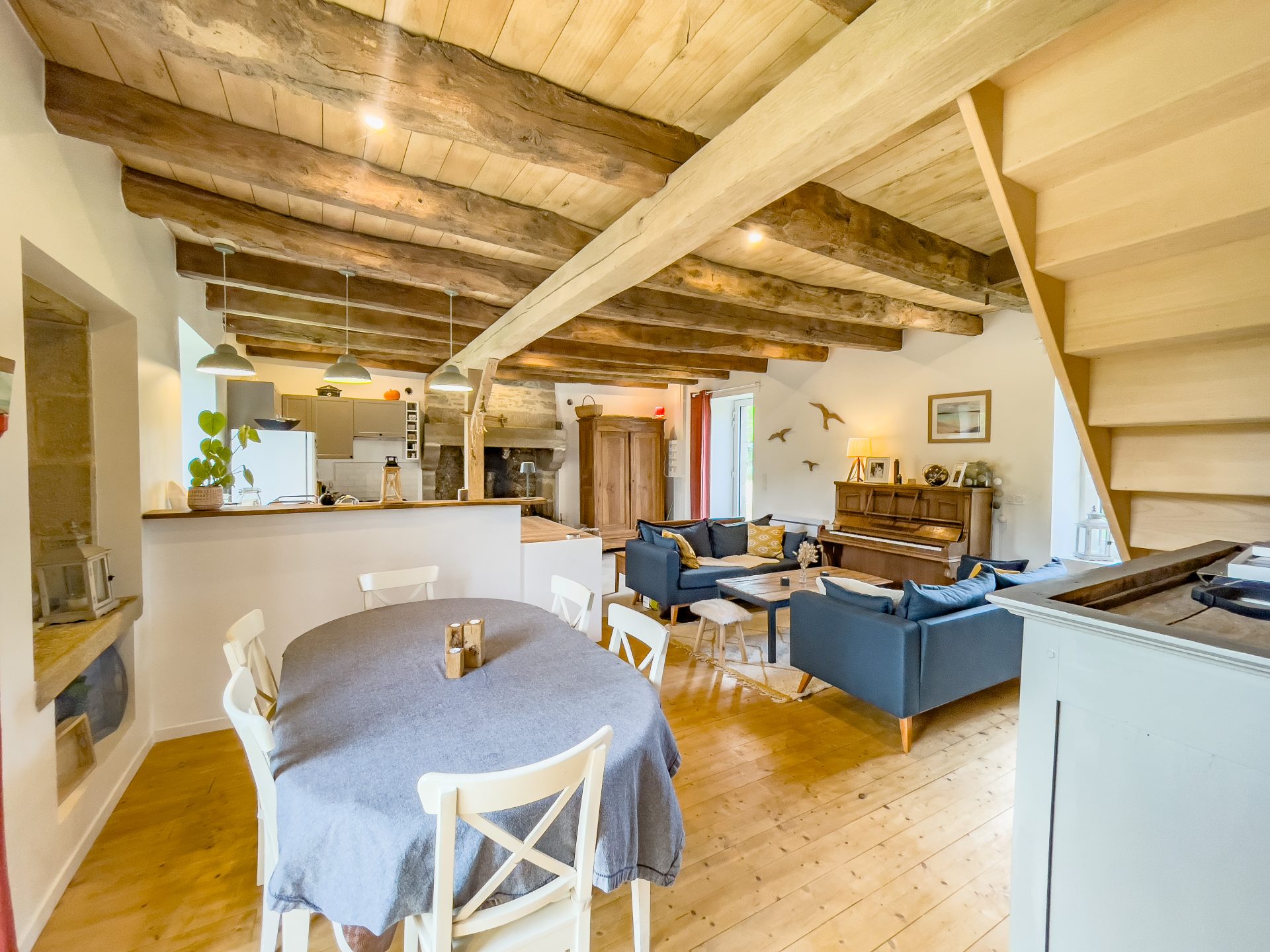 Rénovée avec goût, la maison révèle un cachet incroyable. La cuisine, entièrement aménagée et équipée, est ouverte sur le séjour-salon. Pièce maitresse de ce bel espace de vie, la magnifique cheminée en pierres double foyer, est mise en valeur par les anciens vestiges du passé (pierres naturelles, poutres apparentes, etc.). Un deuxième salon TV ou chambre, une buanderie et des WC indépendants complètent le rez-de-chaussée (possibilité de transformer ces pièces en suite parentale : chambre avec salle d’eau priative, dressing et WC).