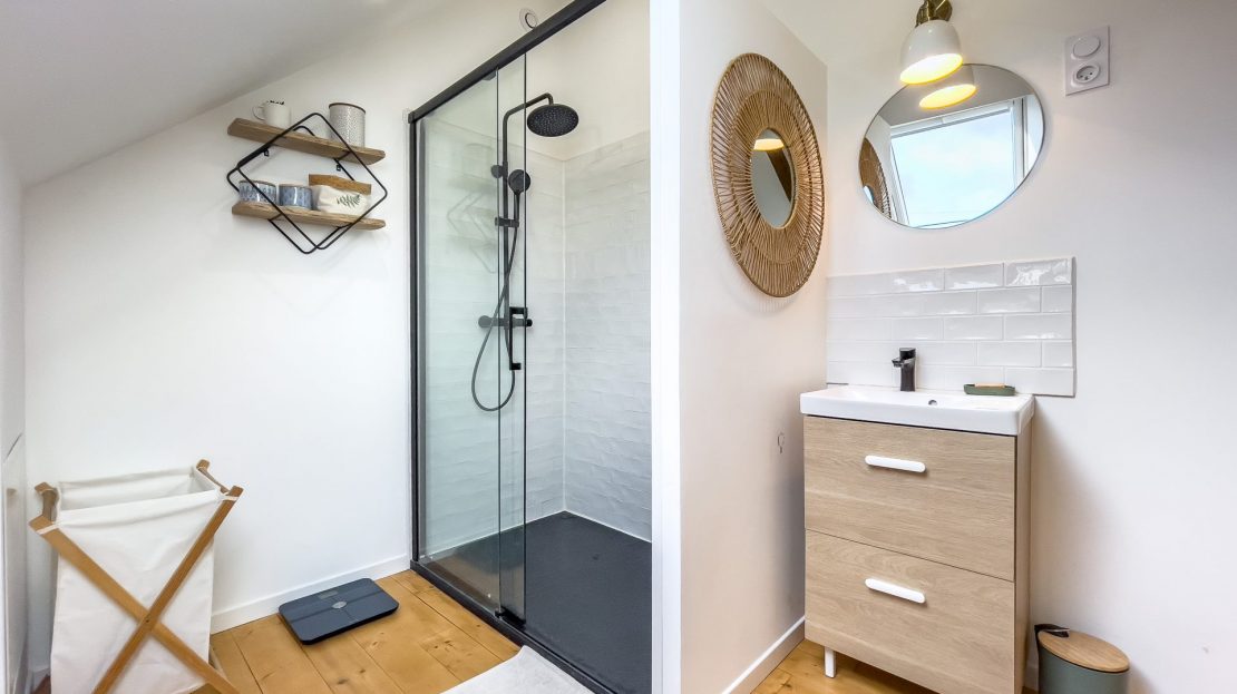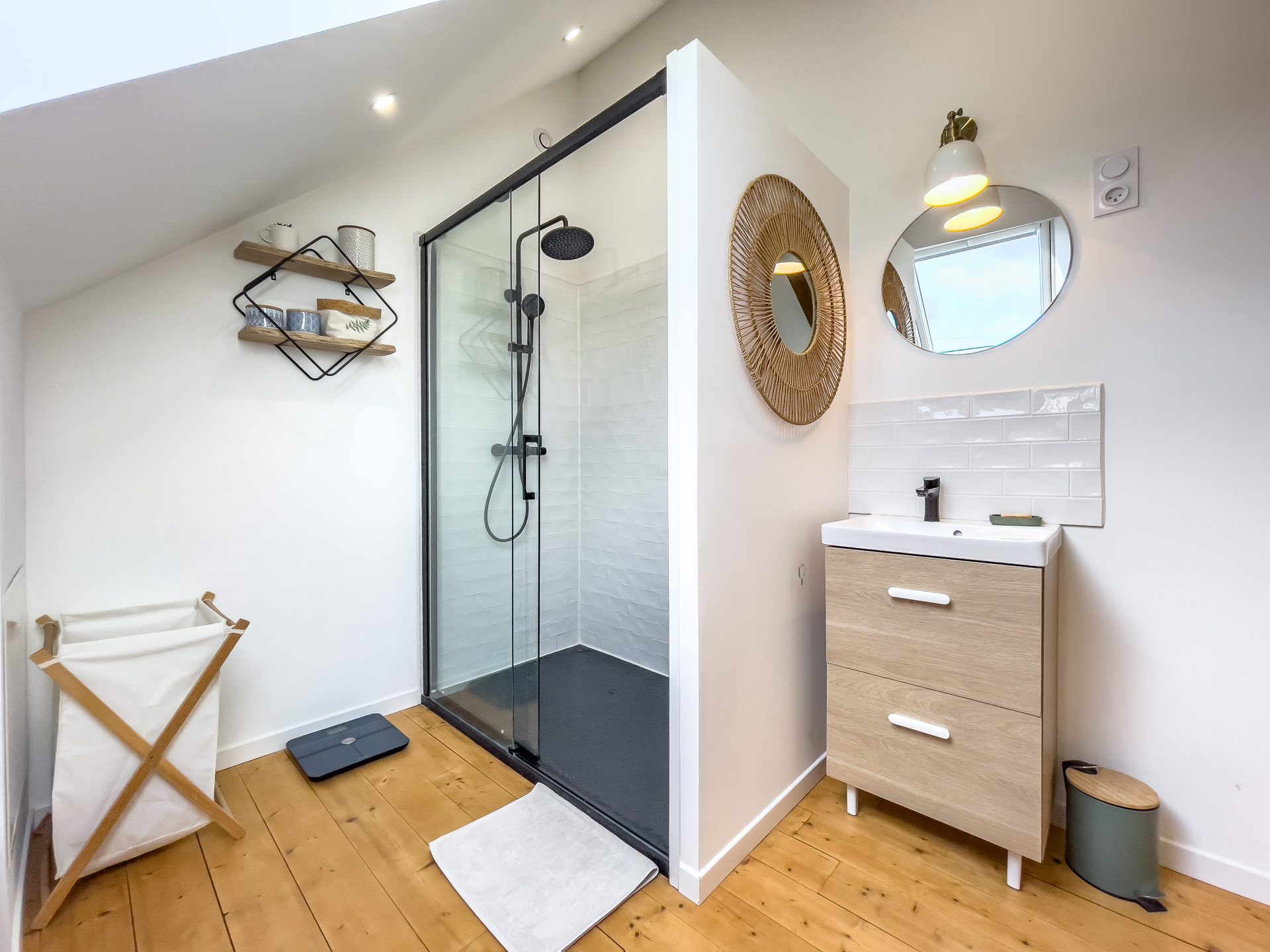 A l’étage, le palier dessert une chambre, un bureau, une somptueuse salle d’eau avec douche à l’italienne et des WC indépendants.